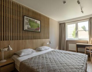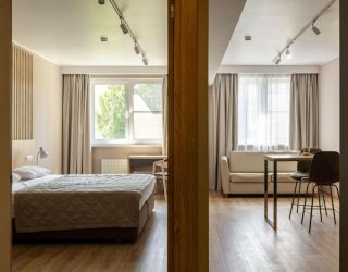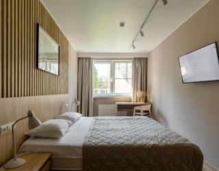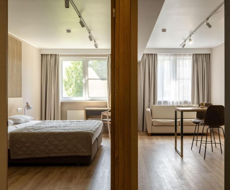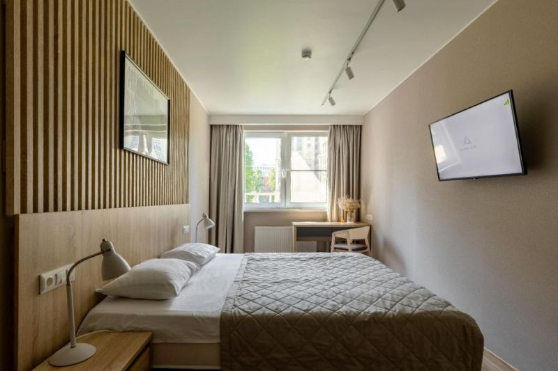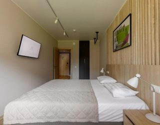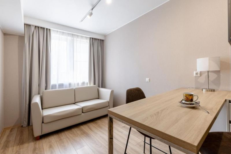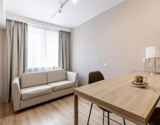 Стильные и просторные однокомнатные апартаменты, оформленные в бежево-кофейных тонах, располагаются в новом апарт-отеле с закрытой территорией. В номере могут с комфортом разместиться 4 гостя: спальня укомплектована большой удобной кроватью, кухня-гостиная — раскладным диваном. Обустроена компактная, но функциональная зона для приготовления блюд, встроена посудомоечная машина. Для вещей предусмотрена вместительная гардеробная. Ванная комната дополнена стиральной машиной. Проживающим доступны Smart TV и Wi-Fi. По согласованию возможно заселение с питомцем.